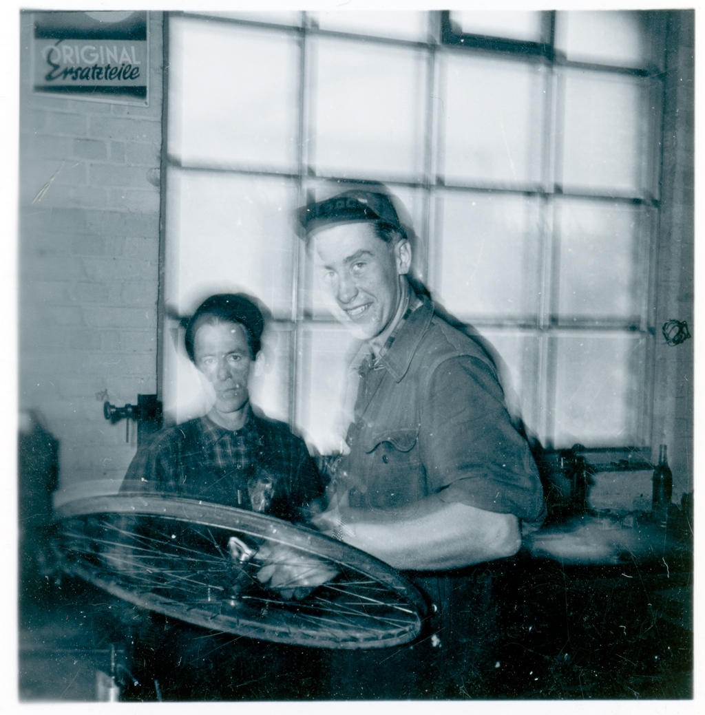 Två män står i Monarks verkstad, framför ett fönster. Den främre mannen håller i ett cykelhjul. Båda tittar in i kameran. Bilden suddig.