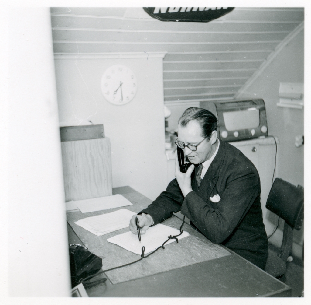 David Danielsson sitter och talar i telefon på Monarks kontor, klockan på väggen bakom honom visar på halv åtta. I bakgrunden står också en radio.