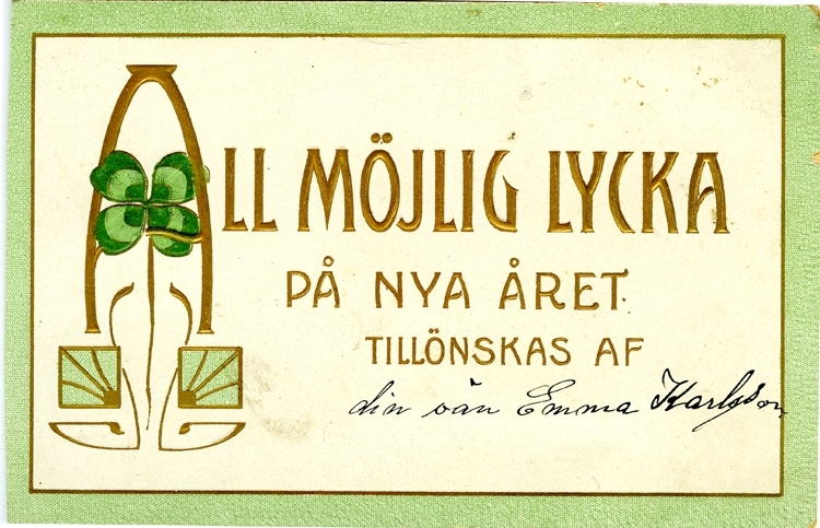 Nyårskort. All Möjlig lycka på nya året tillönskas af din vän Emma Karlsson