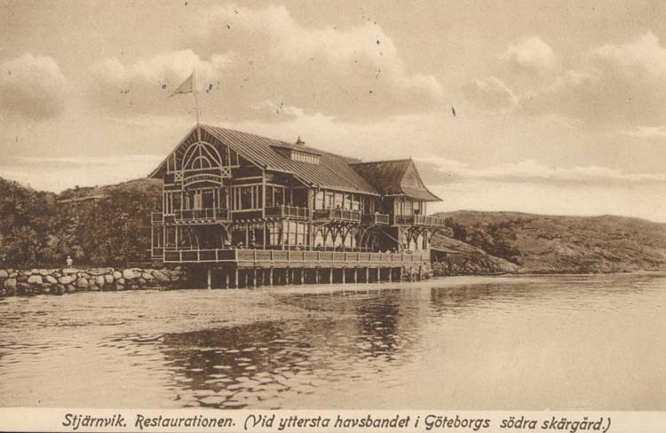 Tryckt text på kortet: "Stjernvik. Restaurationen (Vid yttersta havsbandet i Göteborgs södra skärgård)".