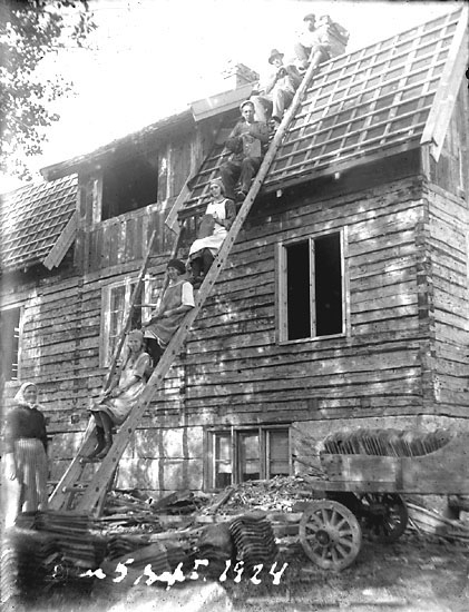 "Husbygge, tegellangning 5 sept. 1924. Lena, Märta, Lisa, Astrid, Karl Hansson, okänd, Einar".