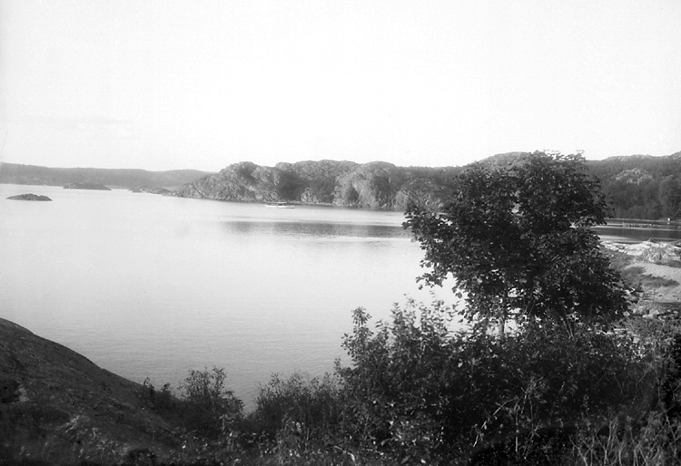 Enligt tidigare noteringar: "Vy tagen från Gustafsberg mot "Hästepallarna". Gustafsbergsbåten på väg in mot Bodelidbryggan."