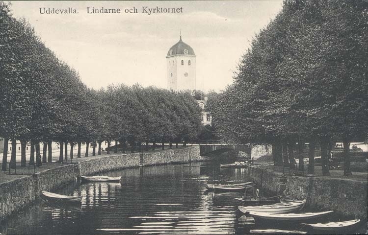 Tryckt text på kortet: "Uddevalla. Lindarna och Kyrktornet."
