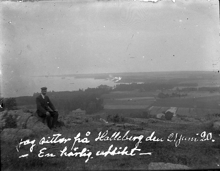 Enligt text på fotot: "Jag sitter på Halleberg den 21 juni 20. - En härlig utsikt -".