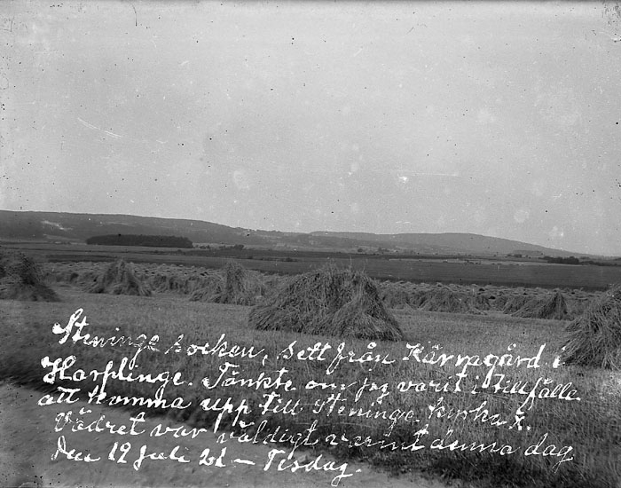 Enligt text på fotot: "Steninge socken, sett från Kärnagård i Harplinge. Tänkte om jag varit i tillfälle att komma upp till Steninge kyrka. Vädret var väldigt varmt denna dag den 19 juli 21 - Tisdag".
