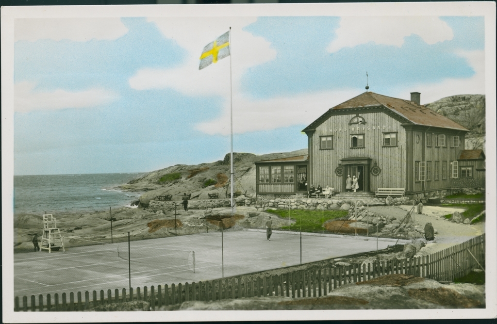 Vykort med motiv från Hönö havsbad med tennisplanen. Två personer står på tennisplanen och utanför havsbadet står två och sitter tre personer, dessa är klädda i 1920-talets mode. Fotografiet är svartvitt men byggnadens tak, gräsytor, havet, himlen och flaggan är kolorerade.