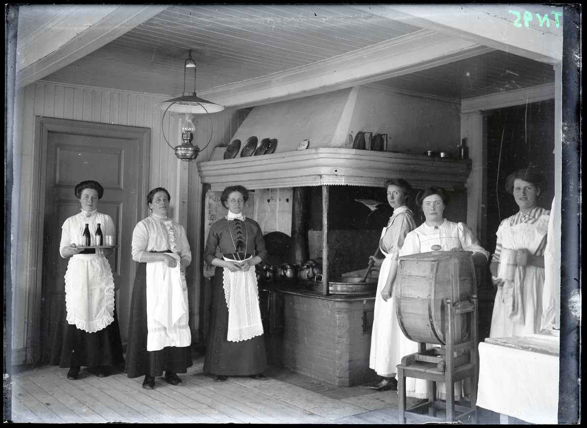 "Interiör från köket med serverings- och kökspersonal vid Gustafsbergs barnhus, internatskola."