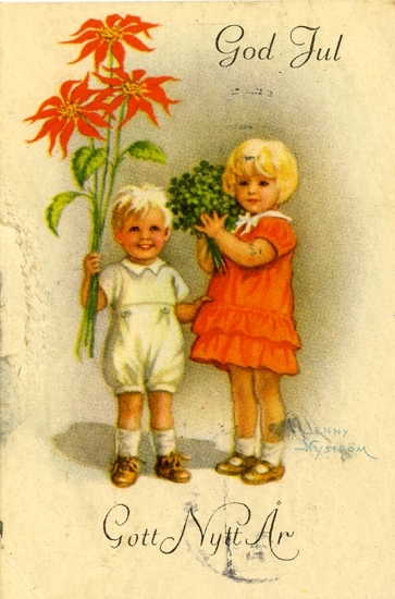 Julhälsning. "God Jul Gott Nytt År". Finklädda barn med buketter i händerna.