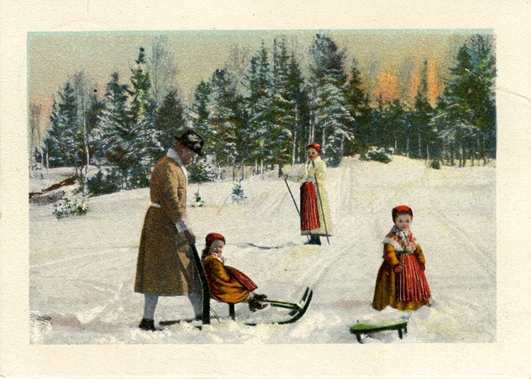 Kort med vintermotiv. Familj i bygdedräkter (folkdräkter) åker spark, skidor och kälke.