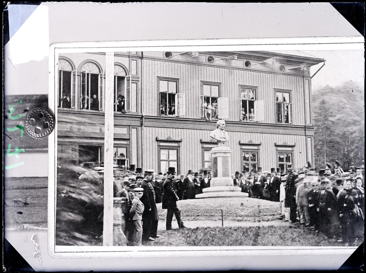 Högtidlig invigning av Anders Knape Hanssons byst den 17 juni 1879 framför gamla barnhusbyggnaden på Gustafsberg, Uddevalla