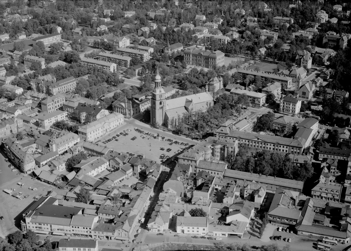 Flygfoto över Falun. Stadsbebyggelse och Kristine kyrka 1956.