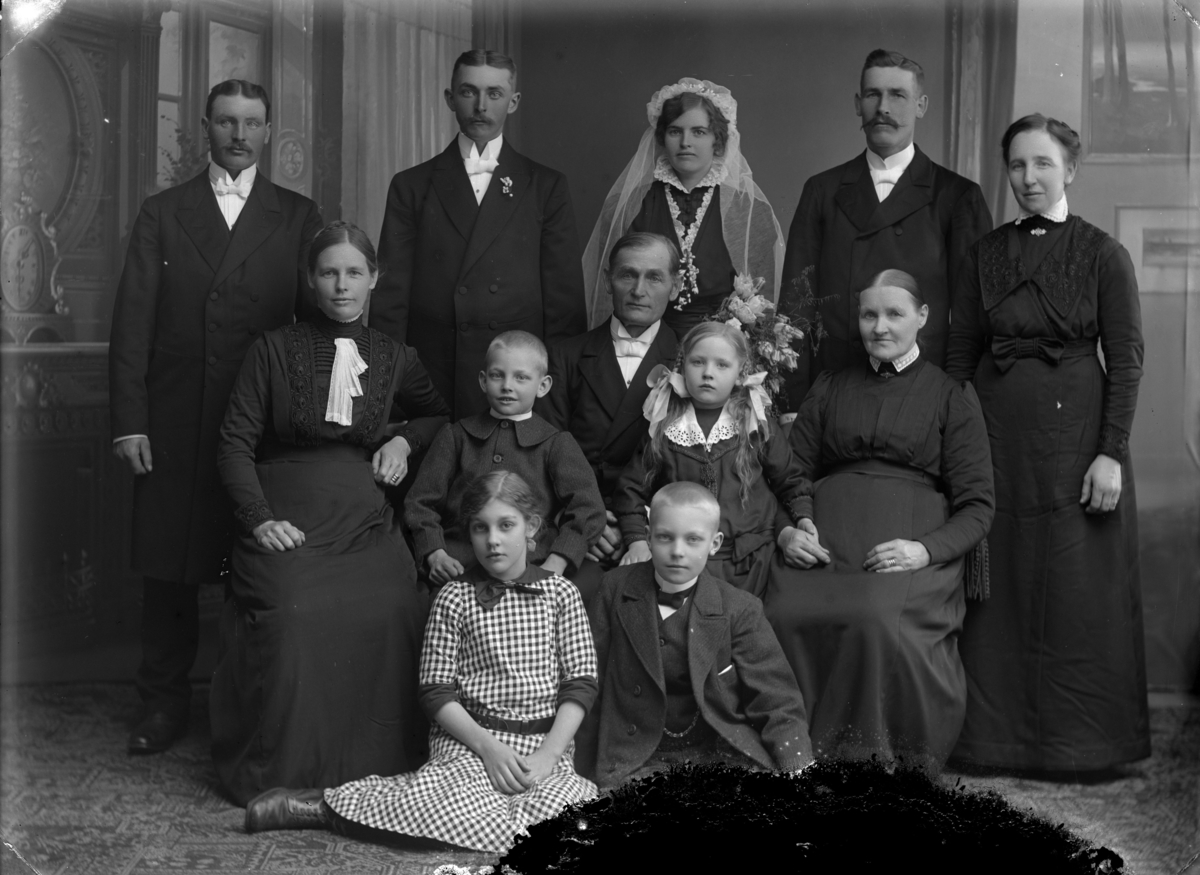 Gruppfoto vid Elis Brunsberg och Gunhild Fredrikssons bröllop, mars 1916. Brudens släkt härrörande från Grän, Långtora socken, Uppland.