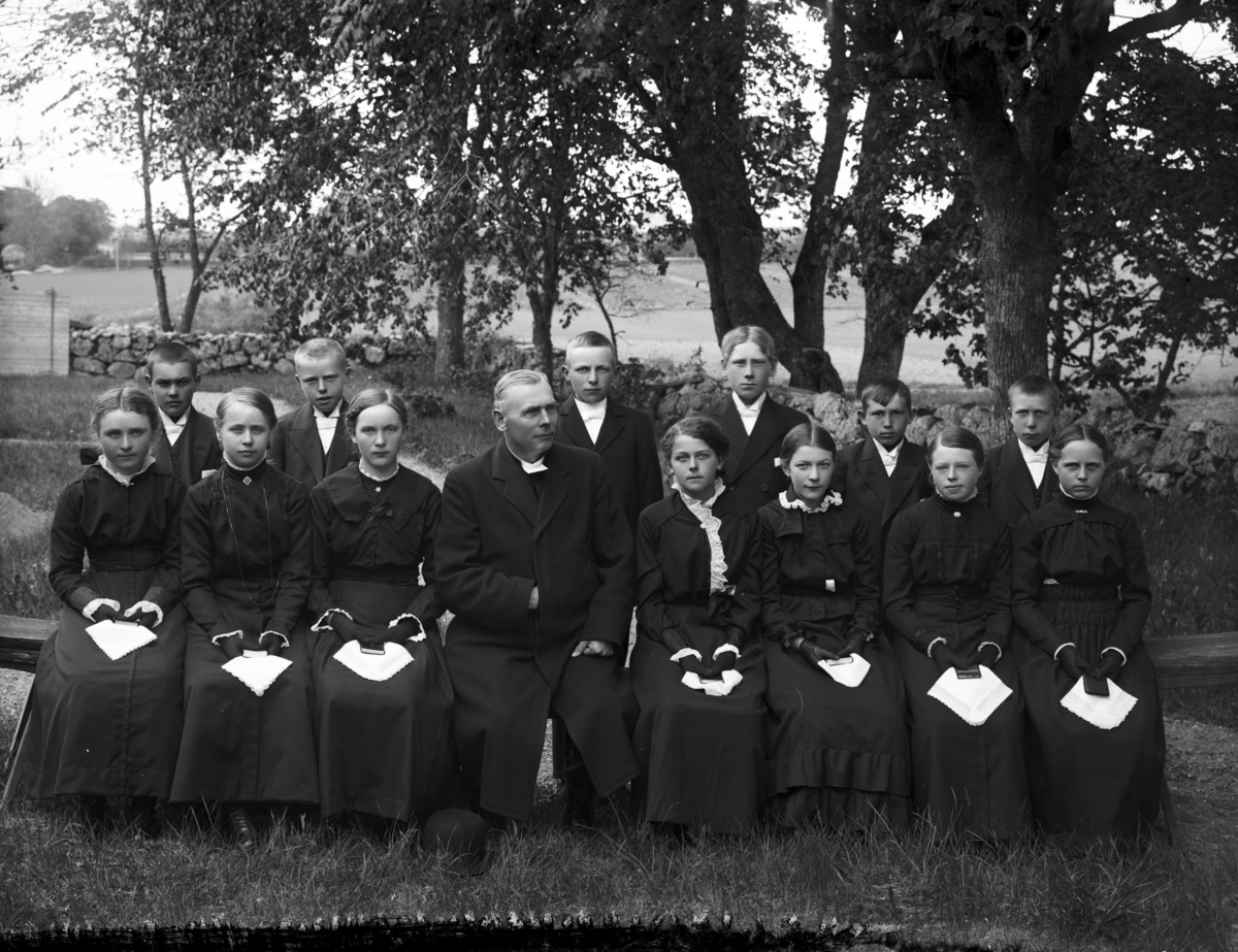 Konfirmandgrupp, sannolikt vid Vallby kyrka, Uppland. I mitten sannolikt kyrkoherde Gustaf Thegerström (1853-1937).