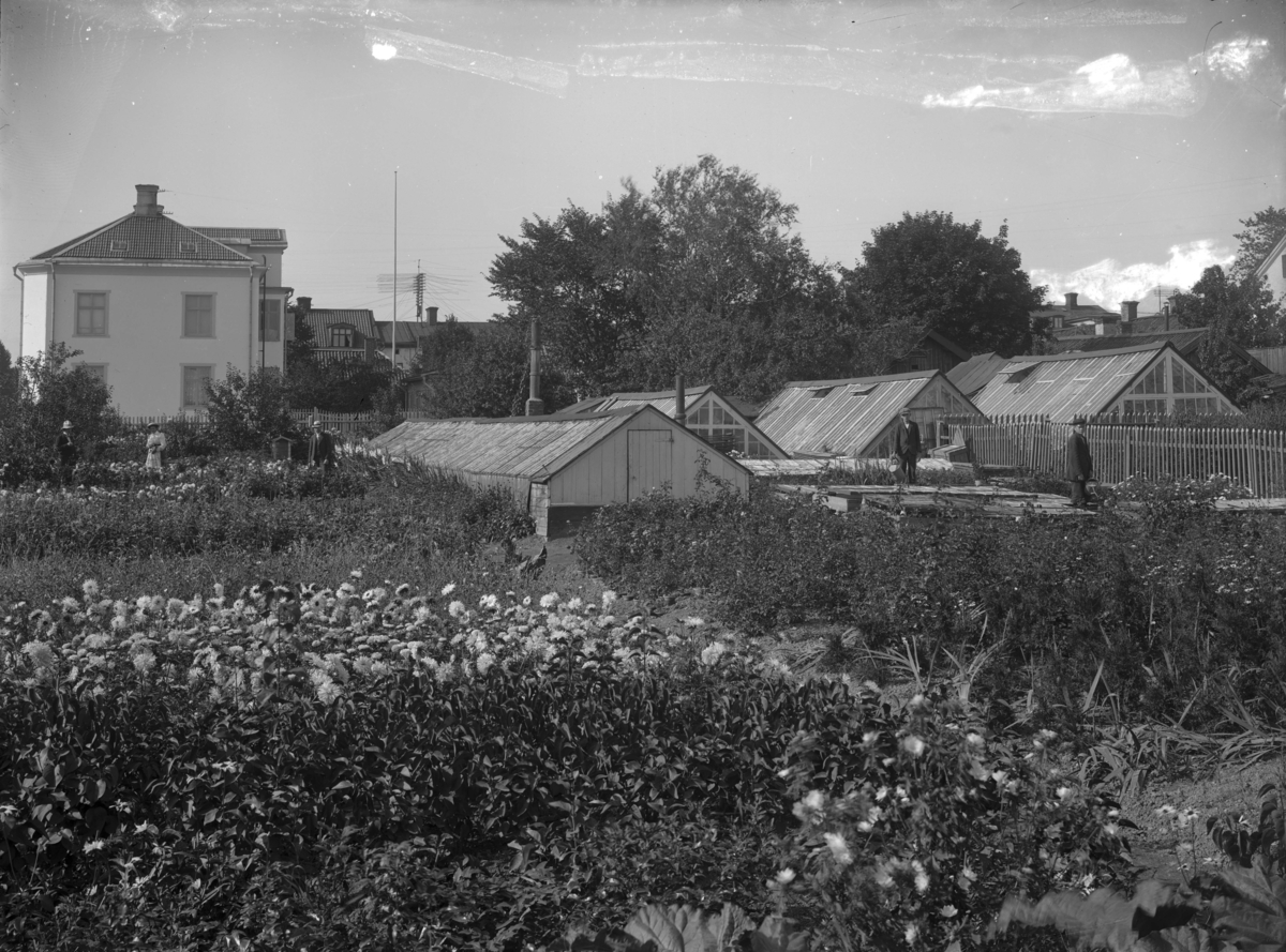 Strömberg & Olssons blomsterhandel, östra hörnet Eriksgatan - Ågatan, Enköping, vy från söder. Major Linds hus till vänster.