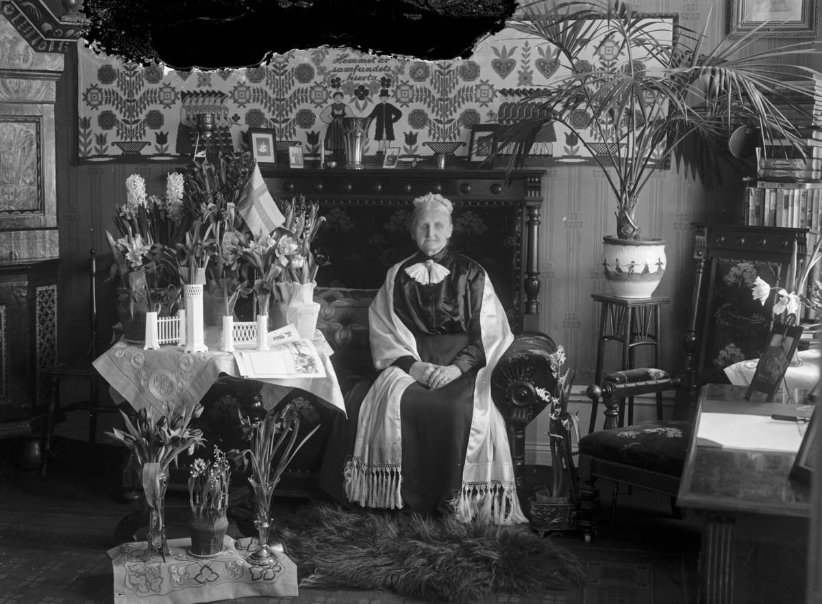 Kvinna i bostadsrum, ev. bemärkelsedag. Till höger kan ses årsböcker från Sveriges Turistförening, som går fram t.o.m. 1917.