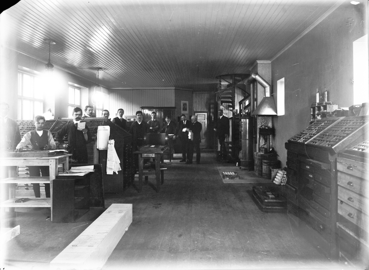 Interiör sätteriet, Enköpings-Posten, Kungsgatan 28, Enköping. Längst till höger direktör Per Johan Andersson, troligen redaktör August Lundin t.v. därom.