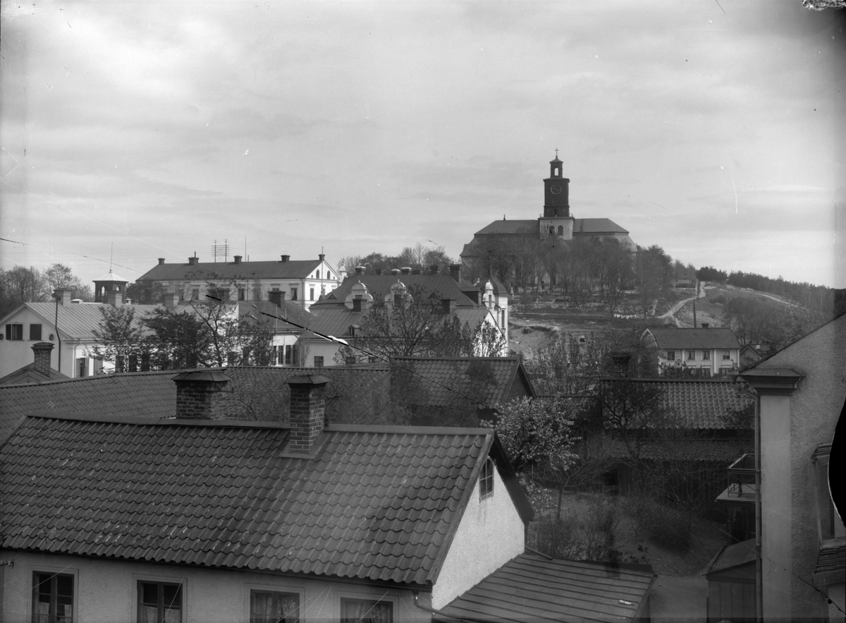 Vy mot norr och bl.a. Vårfrukyrkan, sannolikt från det s.k. telegrafhuset vid Kungsgatan 14, Enköping