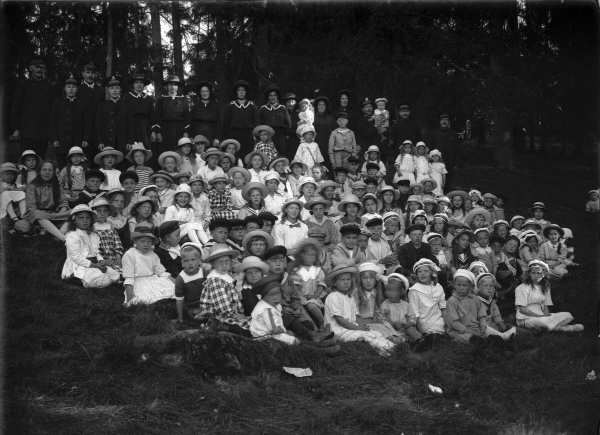 Stor barngrupp med män och kvinnor bakom i Frälsningsarméuniformer