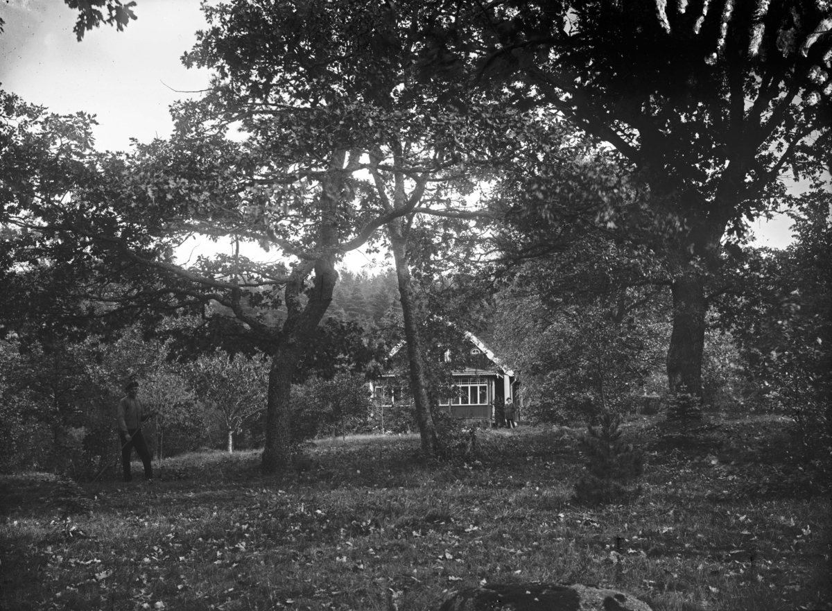 Två män utanför hus, Stora Stämsvik, Övergrans socken, Uppland. Modern adress Målarvägen 10, Bålsta.