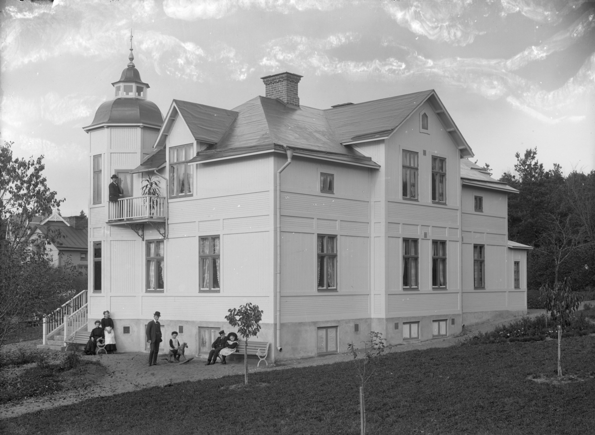 Byggmästare L. P. Sten (1853-1941) med familj, Fannagatan 34, Enköping, vy från söder, troligen 27 oktober 1908