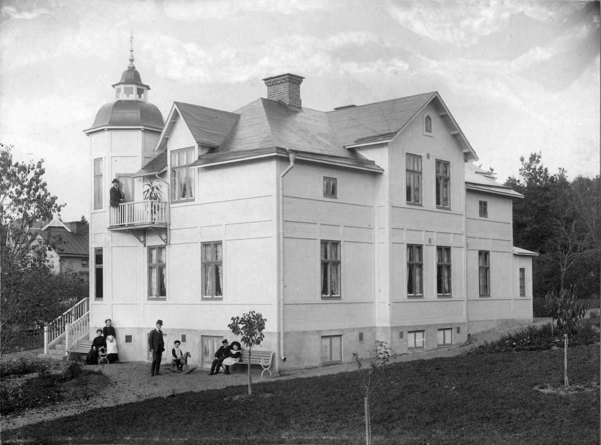 Titel: Byggmästare L. P. Sten med familj vid sin villa, Fannagatan 34, Enköping, sett från söder