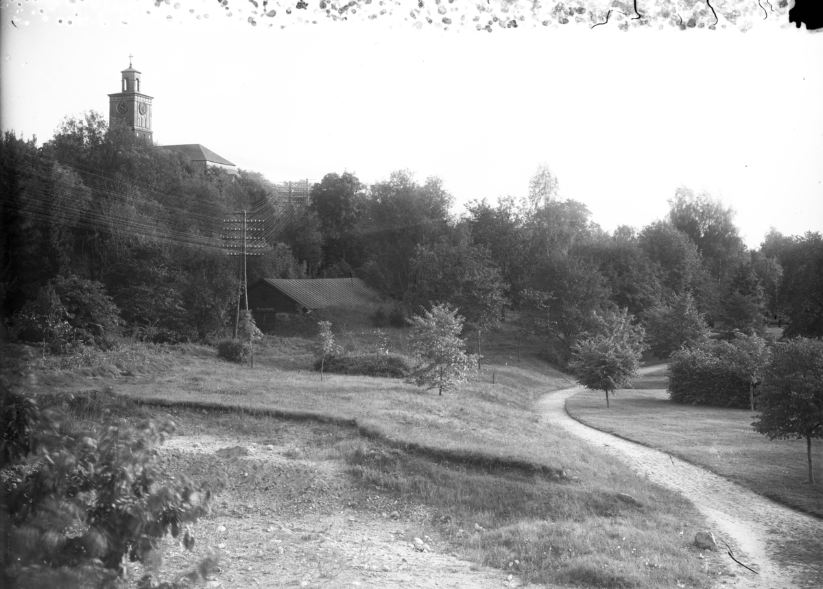 Skolparken, med Vårfrukyrkan till vänster, Enköping. Sett ungefär från Drottninggatan 23, mot söder.