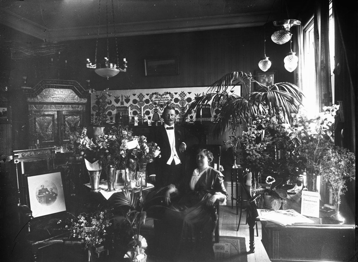 Kvinna och man vid födelsedagsuppvaktning. På papperet längst till höger står "Hjärtliga gratulationer på femtioårsdagen".