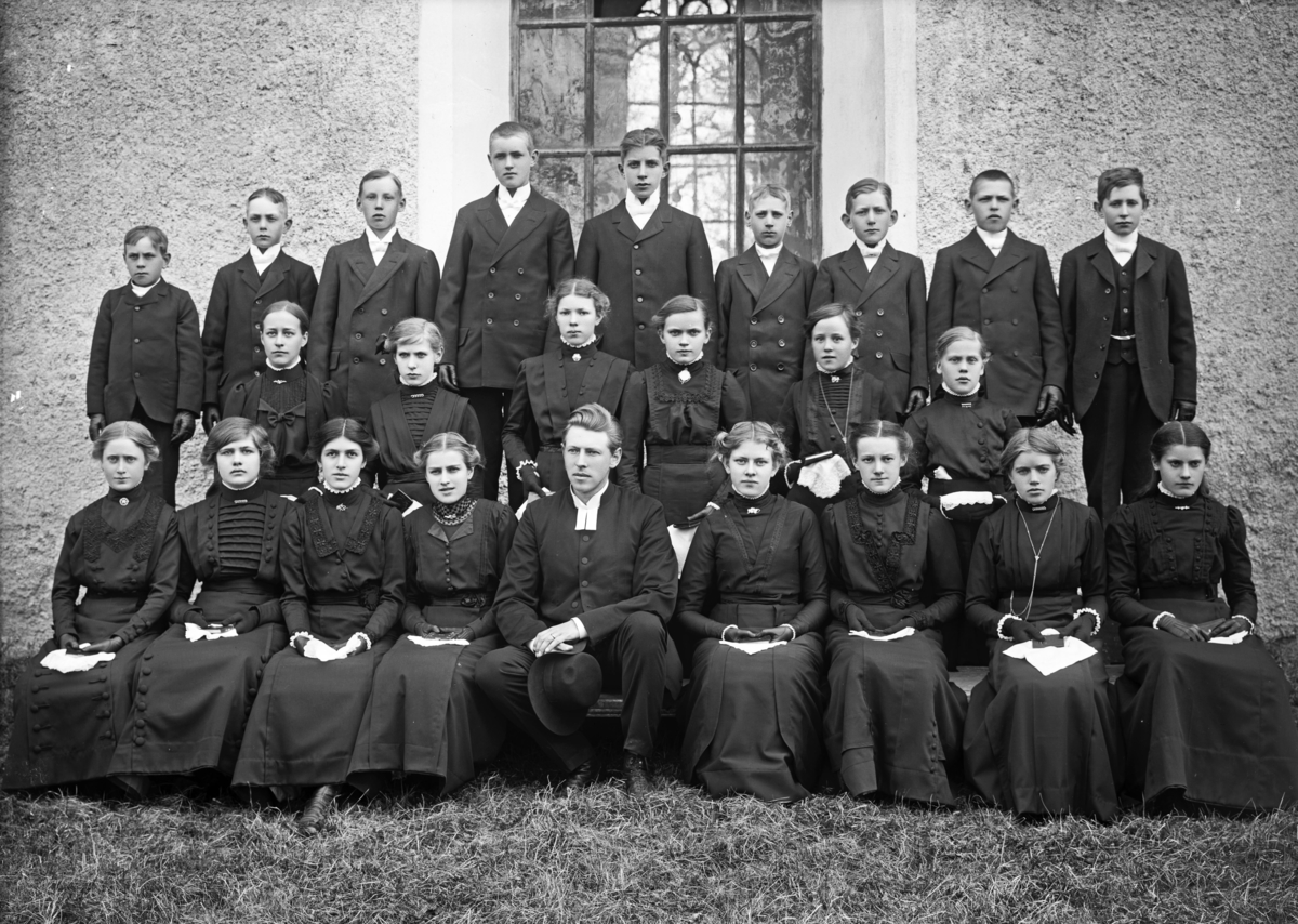 Konfirmandgrupp, sannolikt vid Veckholms kyrka, Uppland, 10 maj 1913. I mitten sannolikt komminister Mats Åmark (1882-1973).
