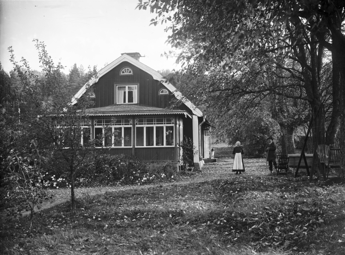 Man och kvinna utanför hus, Stora Stämsvik, Övergrans socken, Uppland. Modern adress Målarvägen 10, Bålsta.