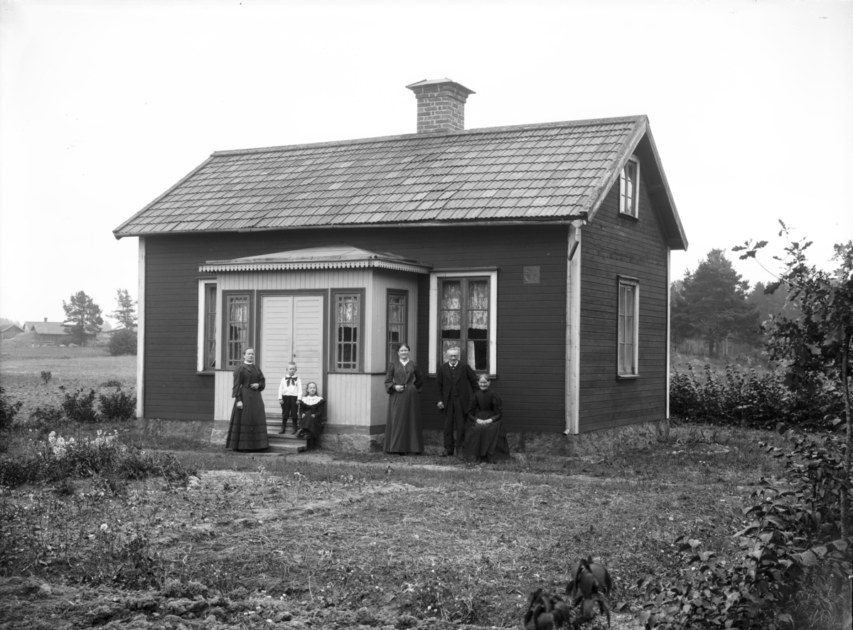Bostadshus, sannolikt i Fanna, Enköping. Skylt på fasaden med text "S.O." (= Södra Området), och ett otydbart nummer.