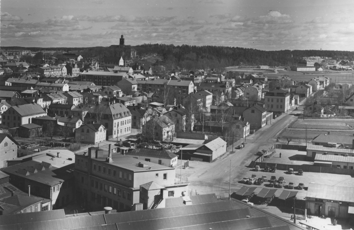Enköping, panorama från silobyggnaden, mot norr. Till höger i bakgrunden Korsängsskolan, grusgropen och skorstenen vid P1. Maj 1956