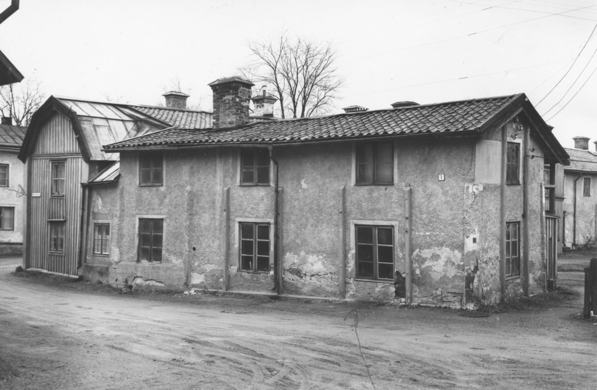 Titel: Enköping, Munksundet, kvarteret Garvaren nr 1, gamla garvargården mot söder från Hantverkaregatan