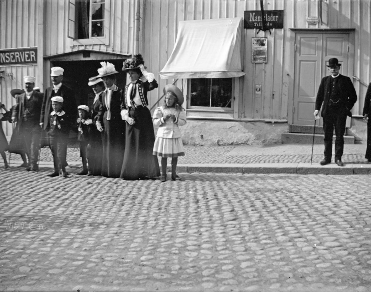 "Åskådare till demonstration". Vid Kungsgatan 18, Enköping, sett från öster.