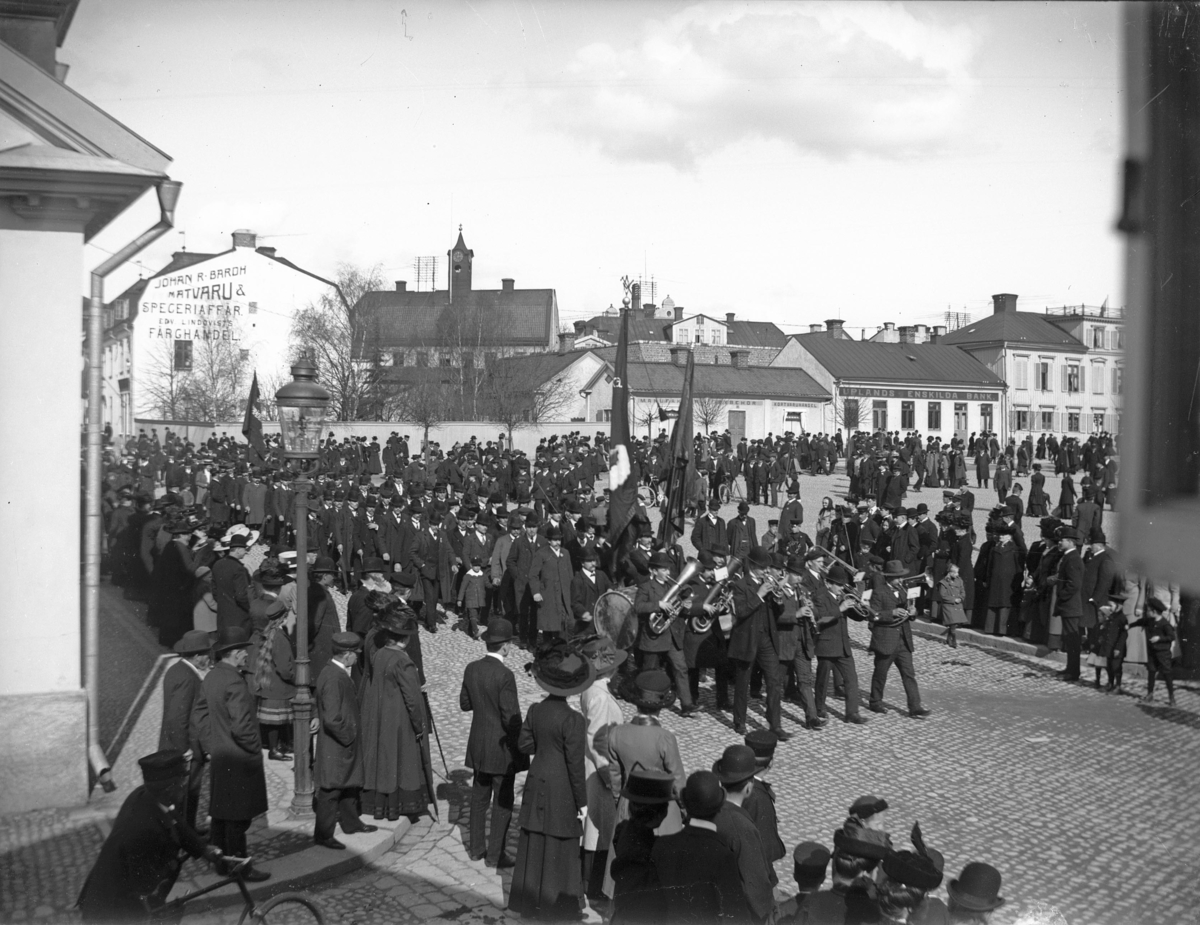 "1 maj, med mycket folk ute i torget". Kyrkogatan/Torget, Enköping, sett från väster.