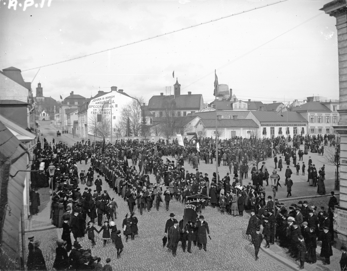 "1 maj, torget". Kyrkogatan/Torget, Enköping, sett från väster.