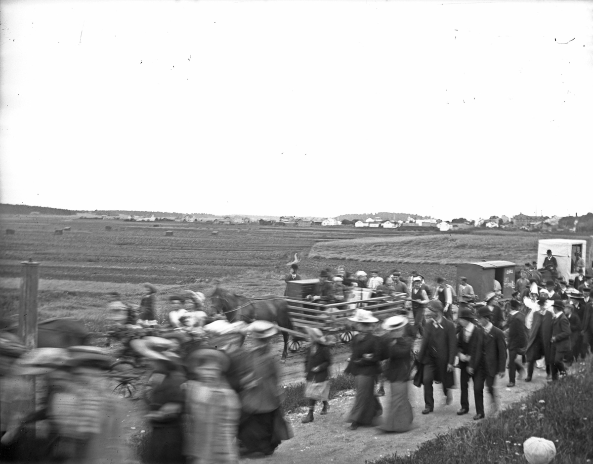 "1 maj". Folktåg sannolikt på Genvägen, Korsängen, Enköping, i vy från Fanna.
