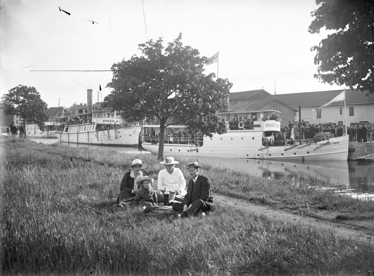 Picknick på åbrinken vid hamnen, Enköping, 1910-talet. Vid kaj fr. v. ångbåtarna Gunhild, Enköping I samt Strängnäs Trafik.