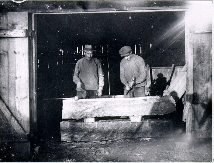Stenhuggare Mårten Karlsson tillverkar portstolpar, Gunnar Arvidsson assisterar.