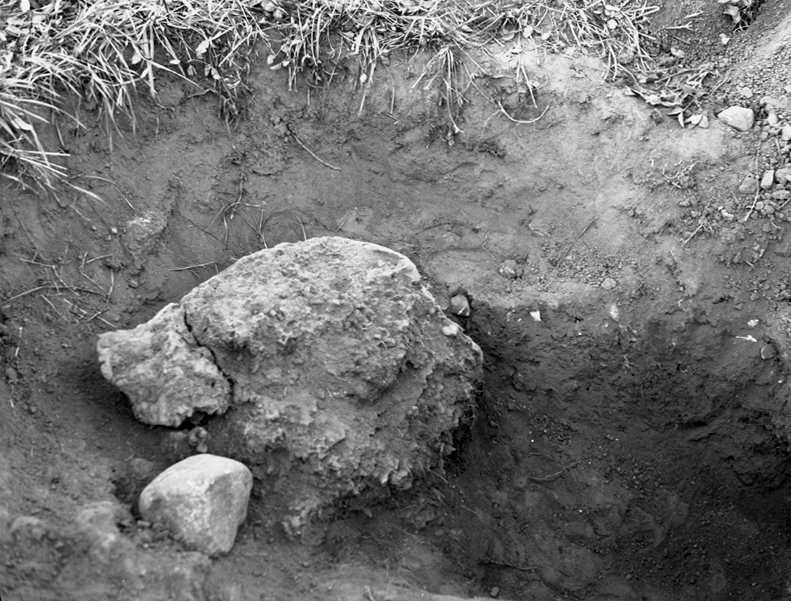 Slaggkaka efter primitiv järnframställning. Rumpegården, Jättene by. Åkern "Jänshögen".