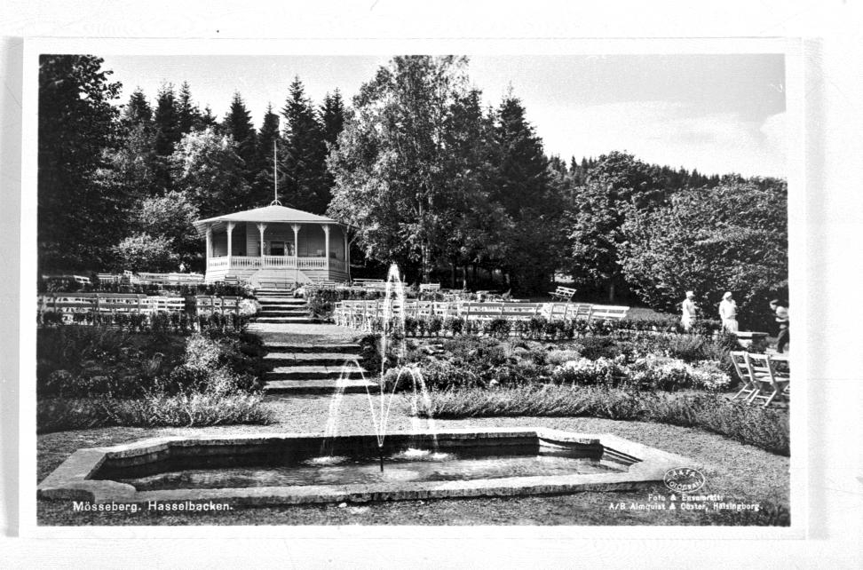 Hasselbacken med fontän, bänkar och planteringar. Onsdagar och lördagar var här musik.
