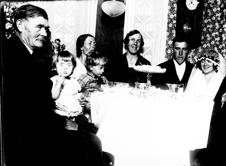 Gustav Adolf Johansson med Britta i knät, Anna Johansson med Sven i knät, Astrid Johansson, brudparet Oskar och Alfhild Hall.