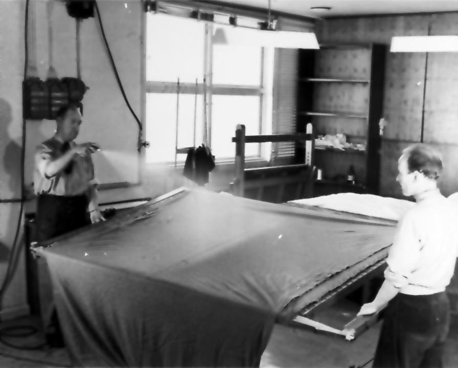 "Tyget spännes" (Ottossons textilfabrik). Från utställningen "Falköping i bild" 1952.