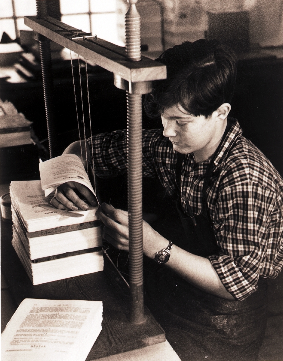 "Lärling häftar för hand". Från utställningen "Falköping i bild" 1952.