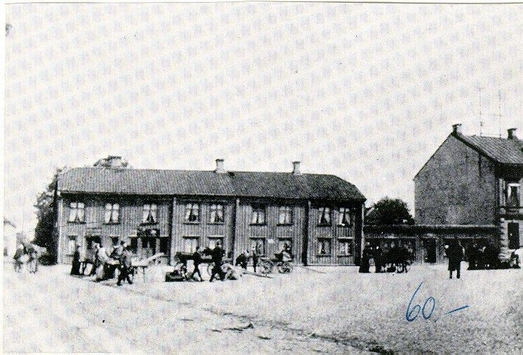 Storgatan 16, Thulinstomten, Per Lars tomt. Kungsgården eller Thulinstomten omkr. 1895. "Kungshuset" på Thulinstomten vid Stora torget var troligen uppfört kort efter den stora branden, som härjade staden 1769. Huset revs 1912 och basarbodarna till höger med sina mjölk- och brödbutiker något tidigare.