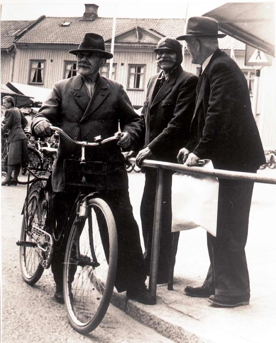 "En pratstund vid Hägertz hörna". Från utställningen "Falköping i bild" 1952.