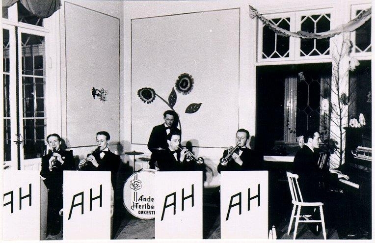 Dansband. Anders Heribertz orkester i Badrestaurangen Mössebergsparken 1940-talet. Från vänster: Olle Alsterfjärd, Stig Johansson, Sven Gunnar Wester, Ingvar Arrestig, Arne Brissman och Anders Heribertz.