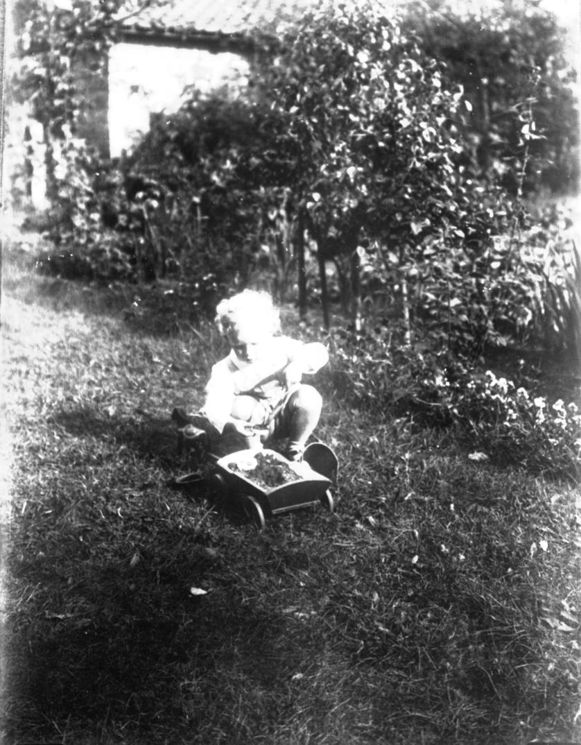 Karin och Axel Lindholms son Sven leker i Ringmans trädgård. Uthuset i Karl Anderssons trädgård bakom.