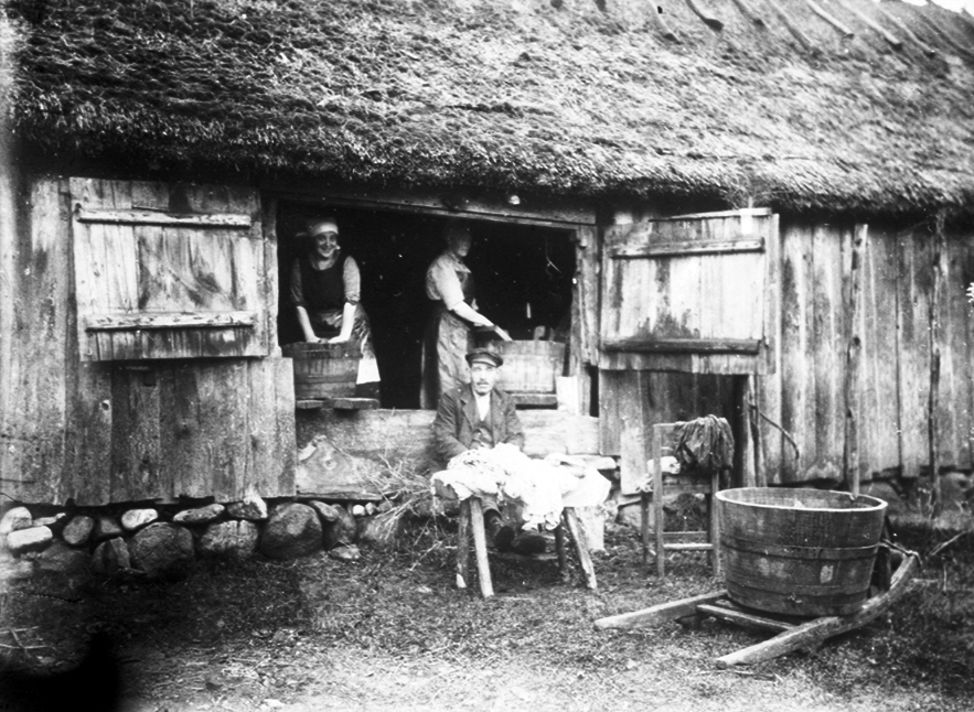 Ellen Johansson och Teresia Andersson tvättar hos "Västa Per" i Sandelid. Den gamla ladugården.
