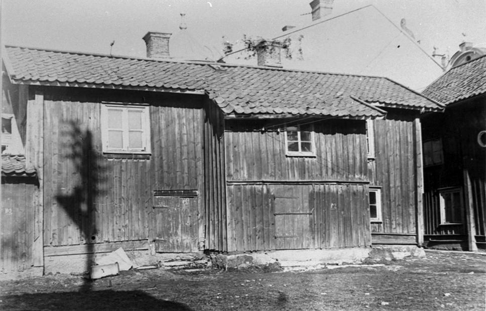 Storgatan 9, "Nymanska gården", exteriör innan Sparbanken byggdes. Gårdsbyggnad från Storgatan 9, i vars övre våning på 1860-talet fröknarna Widerqvists flickskola var inrymd.