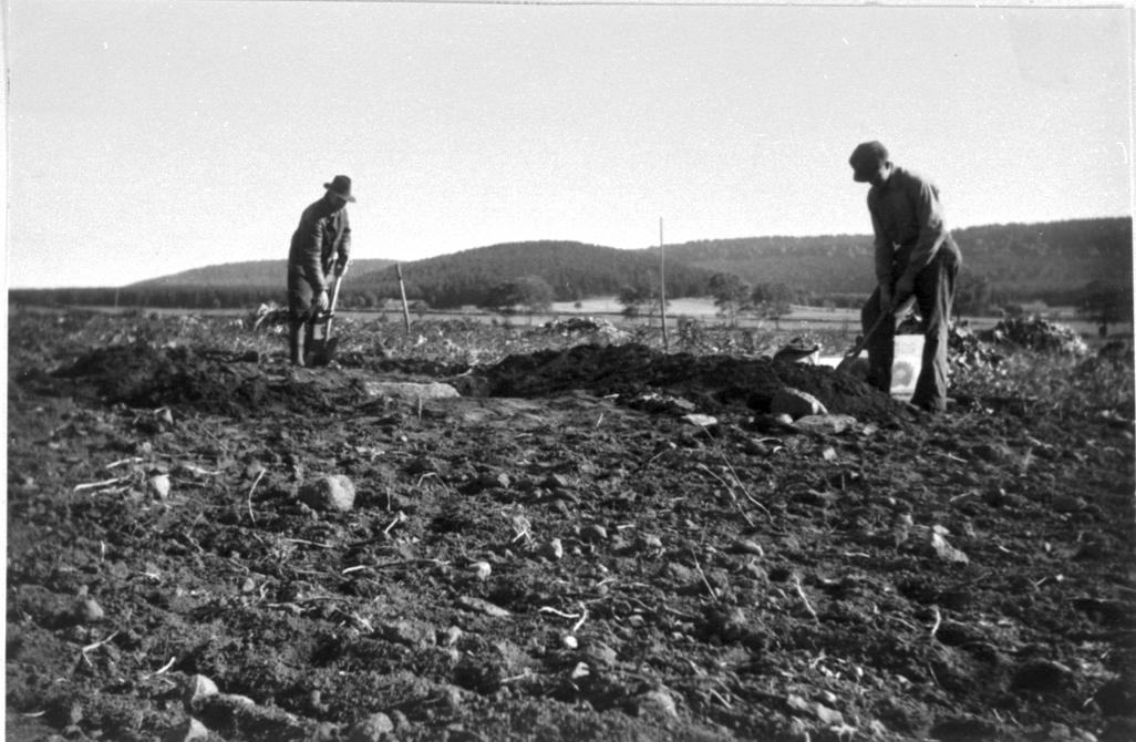Järnåldershällkista. I bakgrunden Björkhögen, Björkhögs kulle och Mösseberg.